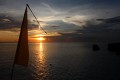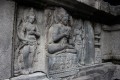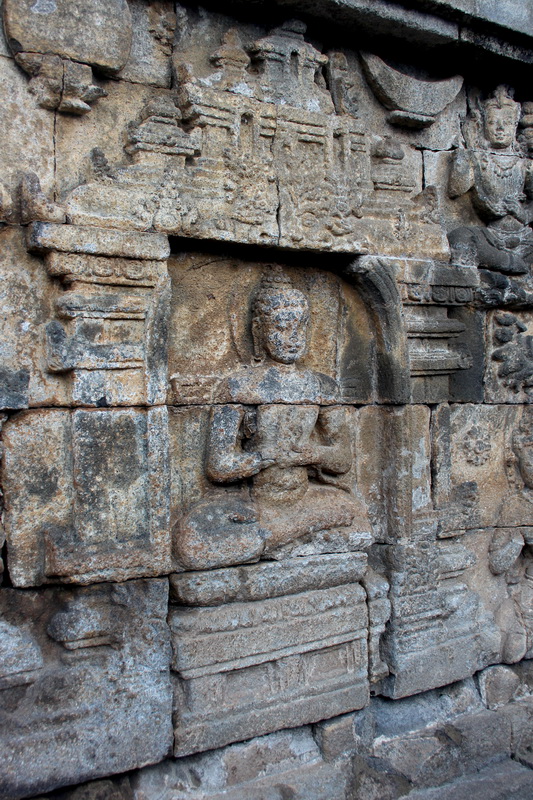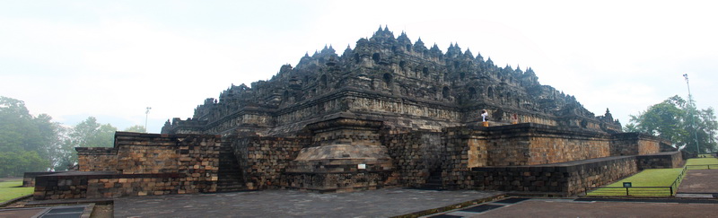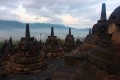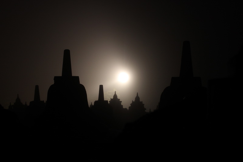 Ale zpět a postupně. Borobudur je budhistická stupa z 8. století, památka UNESCO a prý je to největší celistvá budhistická stavba na světě. My jsme se kvůli časovým důvodům i kvůli zážitku rozhodli zaplatit téměř dvojnásobek normální vstupného za "Borobudur Sunrise Tour" a udělali jsme dobře, protože jsme si mohli celou stupu prohlédnout v relativním klidu v počtu jen asi 40 lidí. S úderem šesté hodiny začaly najíždět zájezdní autobusy a průvodci s tlampači! To už jsme si v klidu dávali snídani, která byla v ceně vstupenky. Bylo sice hodně mraků a mlhy, takže východ slunce příliš vidět nebyl, ale i tak to bylo pěkné.